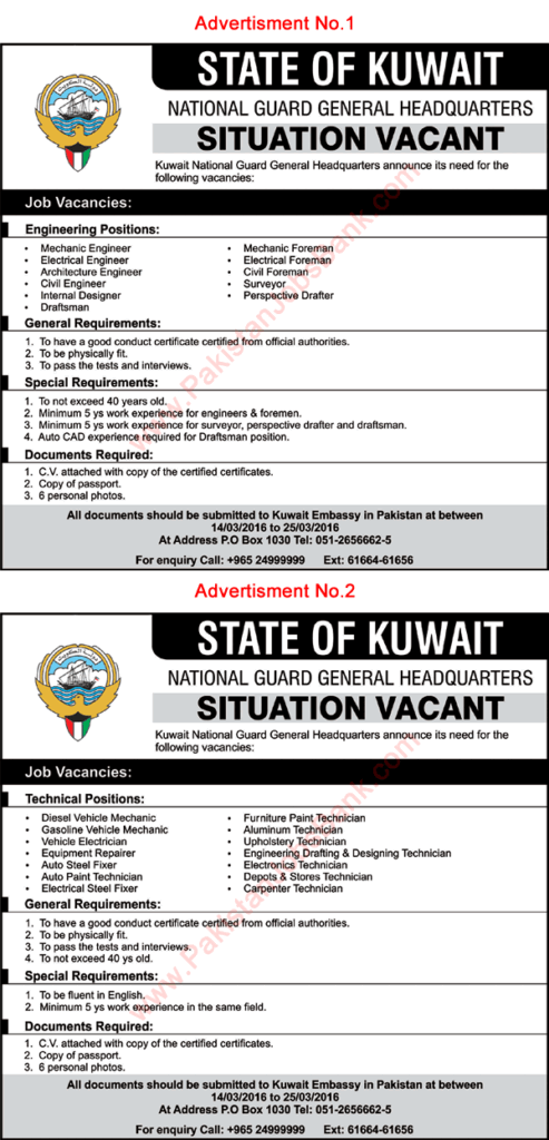 یہ کوئی عام پرائیویٹ کمپنی کی نوکری نہیں ہے۔ یہ موقع سیدھا “کویت کی حکومت” کی طرف سے آیا ہے! کویت نیشنل گارڈ جنرل ہیڈکوارٹرز (STATE OF KUWAIT, NATIONAL GUARD GENERAL HEADQUARTERS) نے پاکستانی ہنرمند افراد کے لیے سینکڑوں آسامیوں کا اعلان کر دیا ہے۔