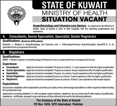 کویت کی وزارت صحت (STATE OF KUWAIT, MINISTRY OF HEALTH) نے اپنے بڑے اور جدید ترین سرکاری ہسپتالوں کے لیے پاکستانی اسپیشلسٹ ڈاکٹروں سے درخواستیں مانگ لی ہیں۔